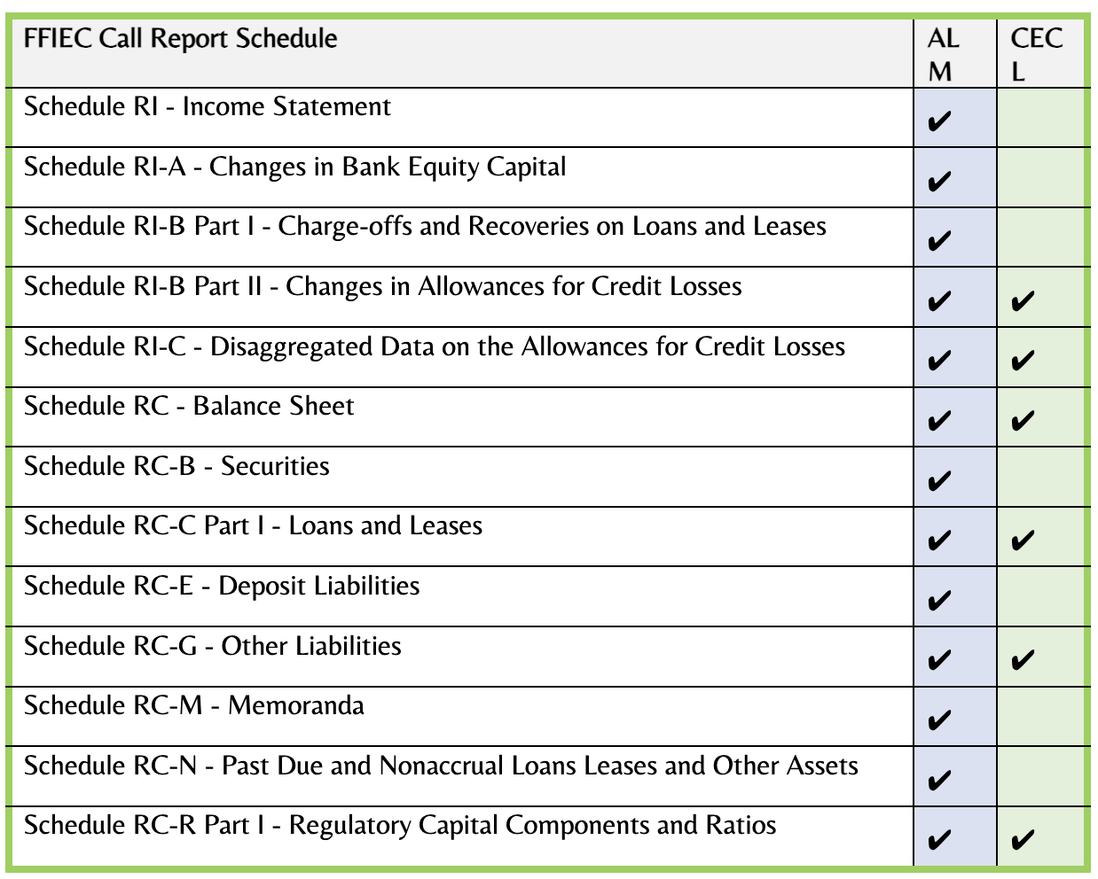 Community banks can gain a competitive edge by employing model validation of their regulatory reporting models. Banks submit quarterly Federal Financial Institutions Examination Council (FFIEC) Call Reports that detail an institution’s business and financial health. These reports mainly employ Asset Liability Management (ALM) and Current Expected Credit Loss (CECL) model outputs. The table lists the key sections of the Call Report and the model outputs